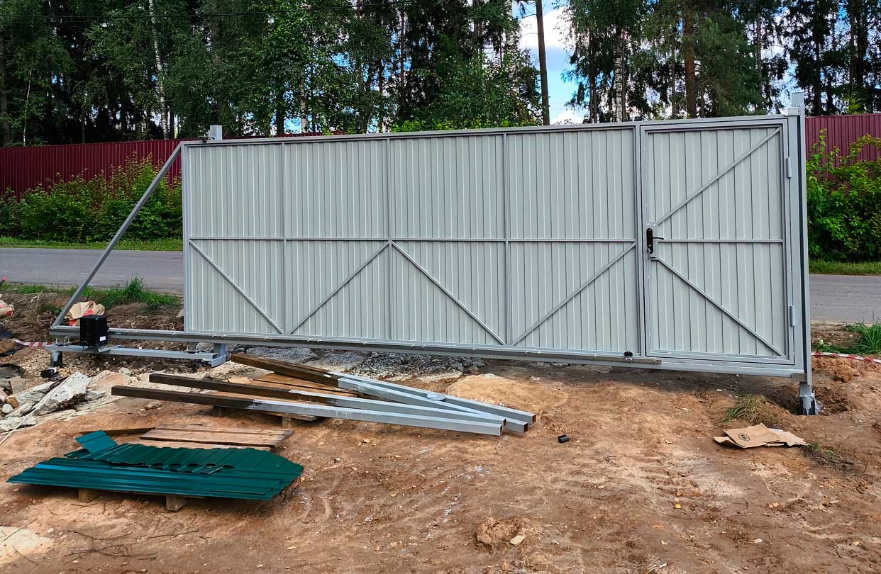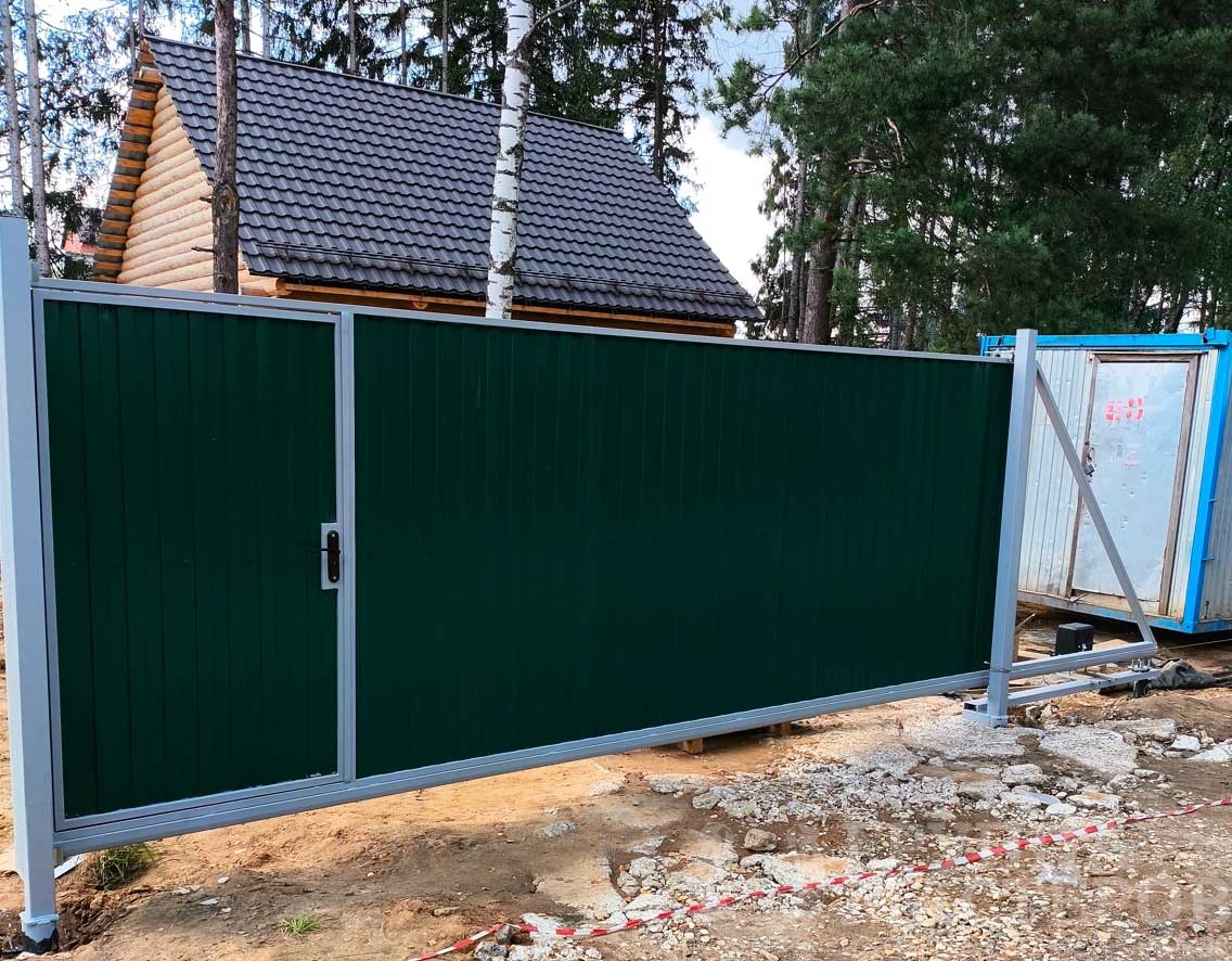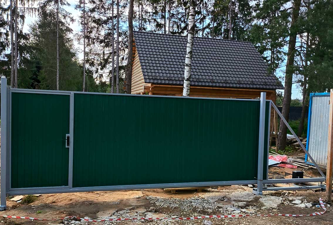 Откатные ворота из профнастила на дачном участке