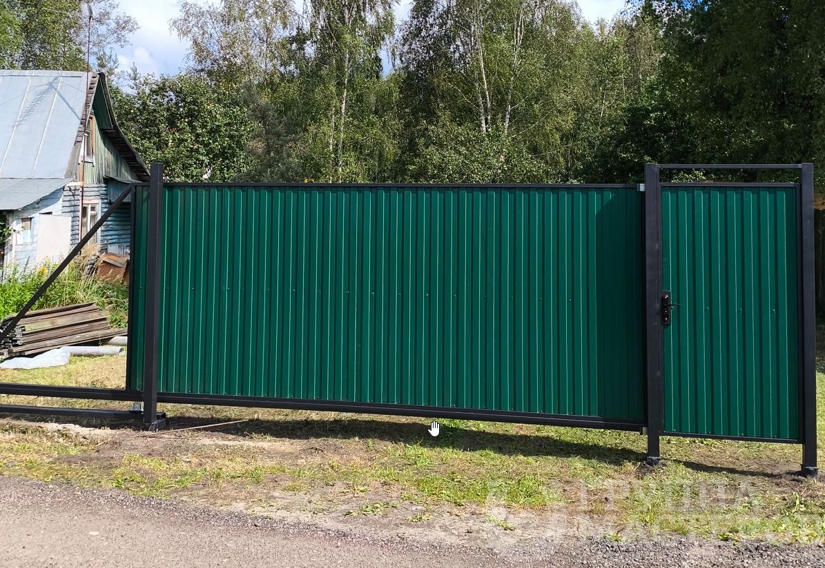 На участке установлены откатные ворота из профлиста. Конструкция отличается простотой, надежностью и современным внешним видом. Благодаря откатной системе створка плавно перемещается вдоль забора, не занимая дополнительного места при открывании — это особенно удобно при ограниченном пространстве на въезде.