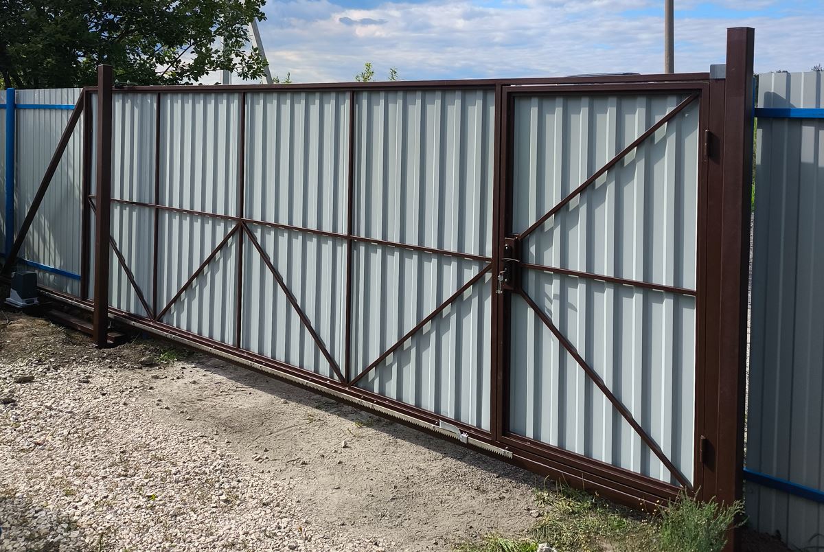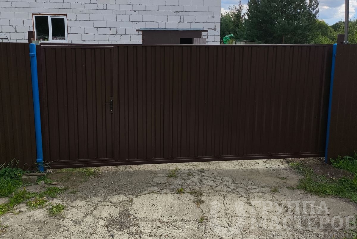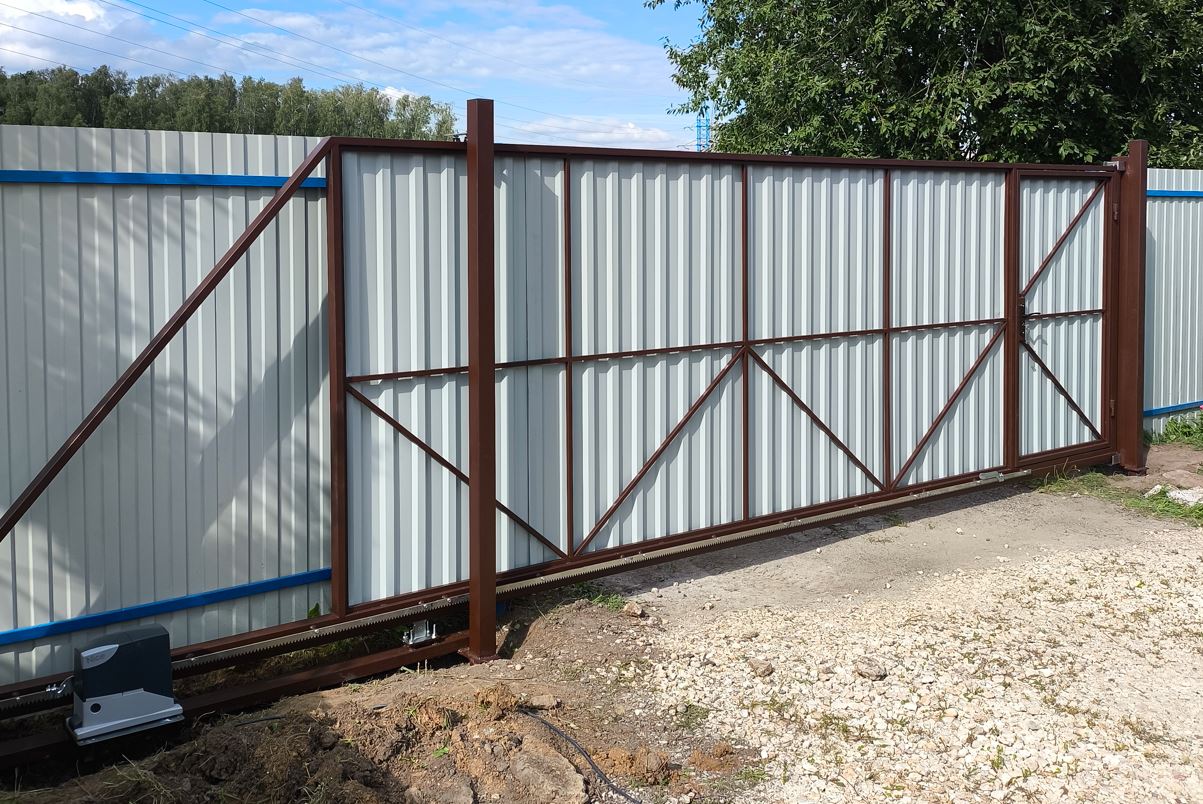 В Истре установлены автоматические откатные ворота с калиткой. Конструкция выполнена из прочного профлиста на металлическом каркасе, что обеспечивает надежность и привлекательный внешний вид. Встроенная калитка делает использование ворот более удобным для повседневного прохода.