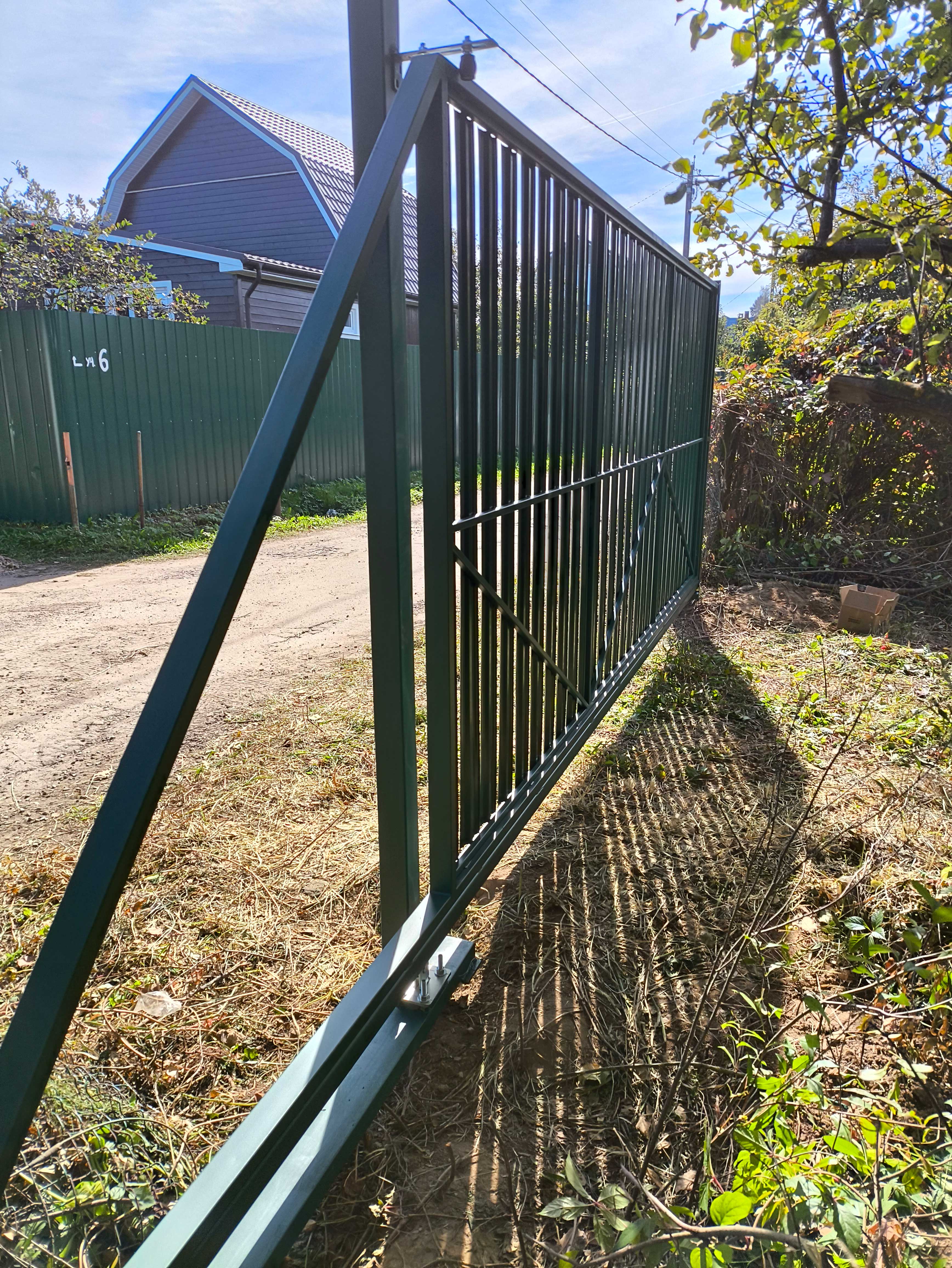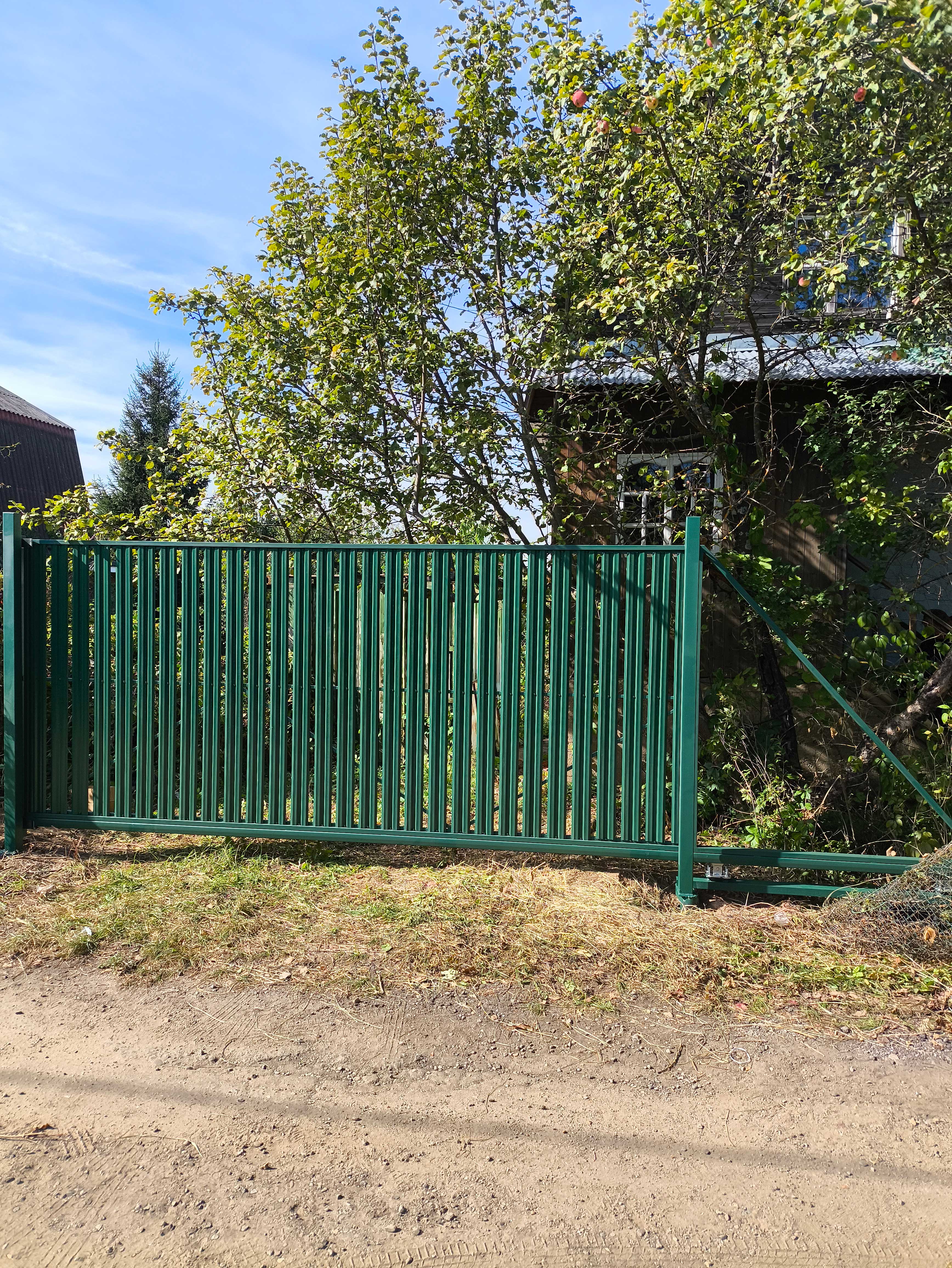 На участке установлены откатные ворота из евроштакетника без автоматики. Конструкция выполнена на прочном металлическом каркасе, что обеспечивает стабильность и долговечность при ежедневной эксплуатации.