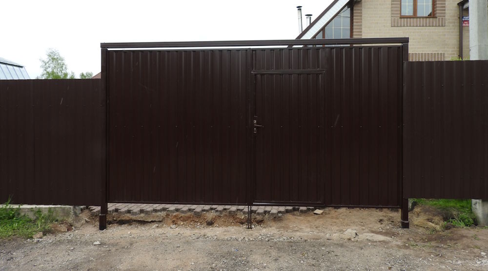 Для облицовки распашных ворот на винтовых сваях подойдут практически все востребованные сегодня материалы — от стали и деревянных панелей до 3D-сетки Гиттер. Однако оптимальным решением для створок чаще становятся профлист с хорошими защитными и маскирующим свойствами либо эстетичный и достаточно легкий евроштакетник.